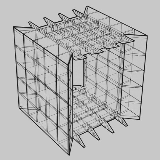 Les parois intérieures qui se font face, laissent apparaître des caissons vitrés dans leur renfoncement, mais l’architecte souhaitait, à l’origine, que ceux-ci soient entièrement recouverts de vitres carrées et offrent un aspect lisse, comme les façades extérieures.